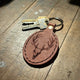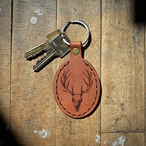 This handcrafted leather keychain features an engraved set of deer antlers—symbolic of grace, renewal and the quiet strength found in the wild. Cut from full-grain leather in a warm, natural tan colour, it’s finished with hand-stitched detailing and a brass rivet.