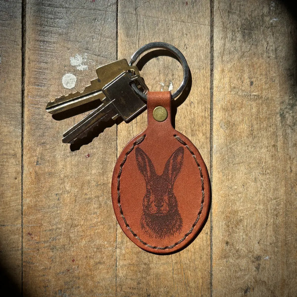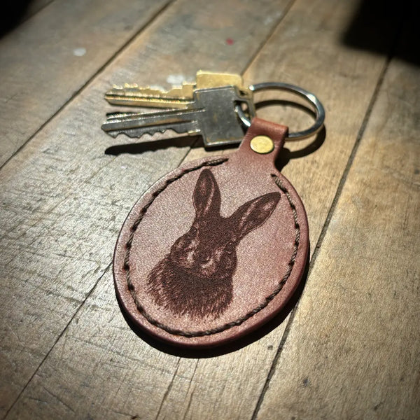 This handcrafted leather keychain features the finely etched face of a hare—an animal known for its agility, awareness and connection to the rhythms of the natural world. Cut from full-grain leather in a warm, earthy tone, it’s finished with hand-stitched edging and a brass rivet that anchors the piece with quiet strength.