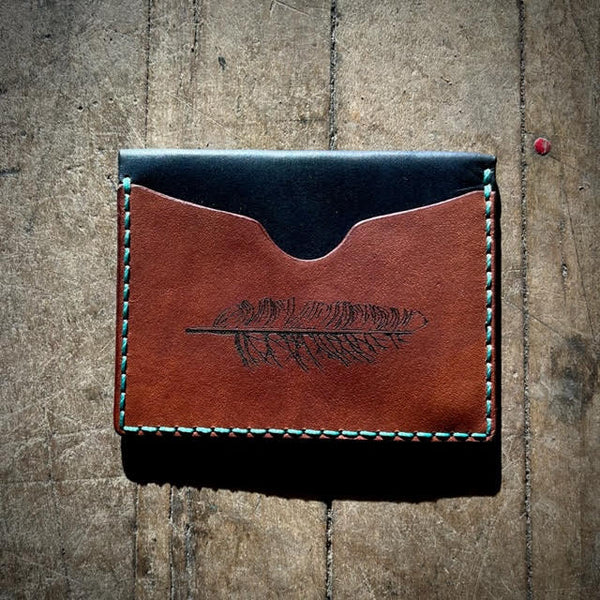 Perfect for the light packer, this wallet effortlessly holds 5-7 cards and features two purposeful pockets – one for cards and another for bills and essentials like your fishing license. Fashioned from premium veg-tan leather in light brown and black, accented with light blue thread, it's both refined and functional.