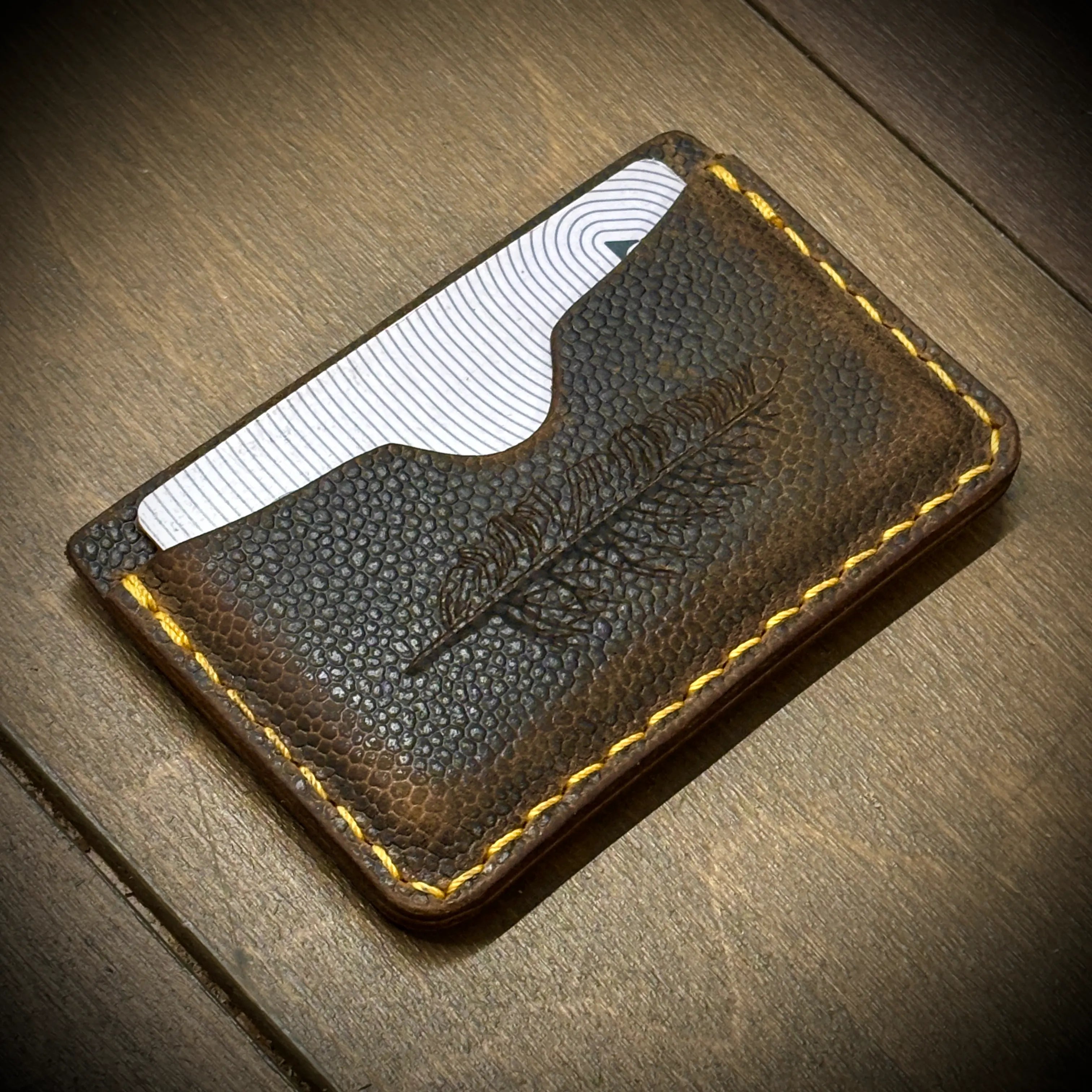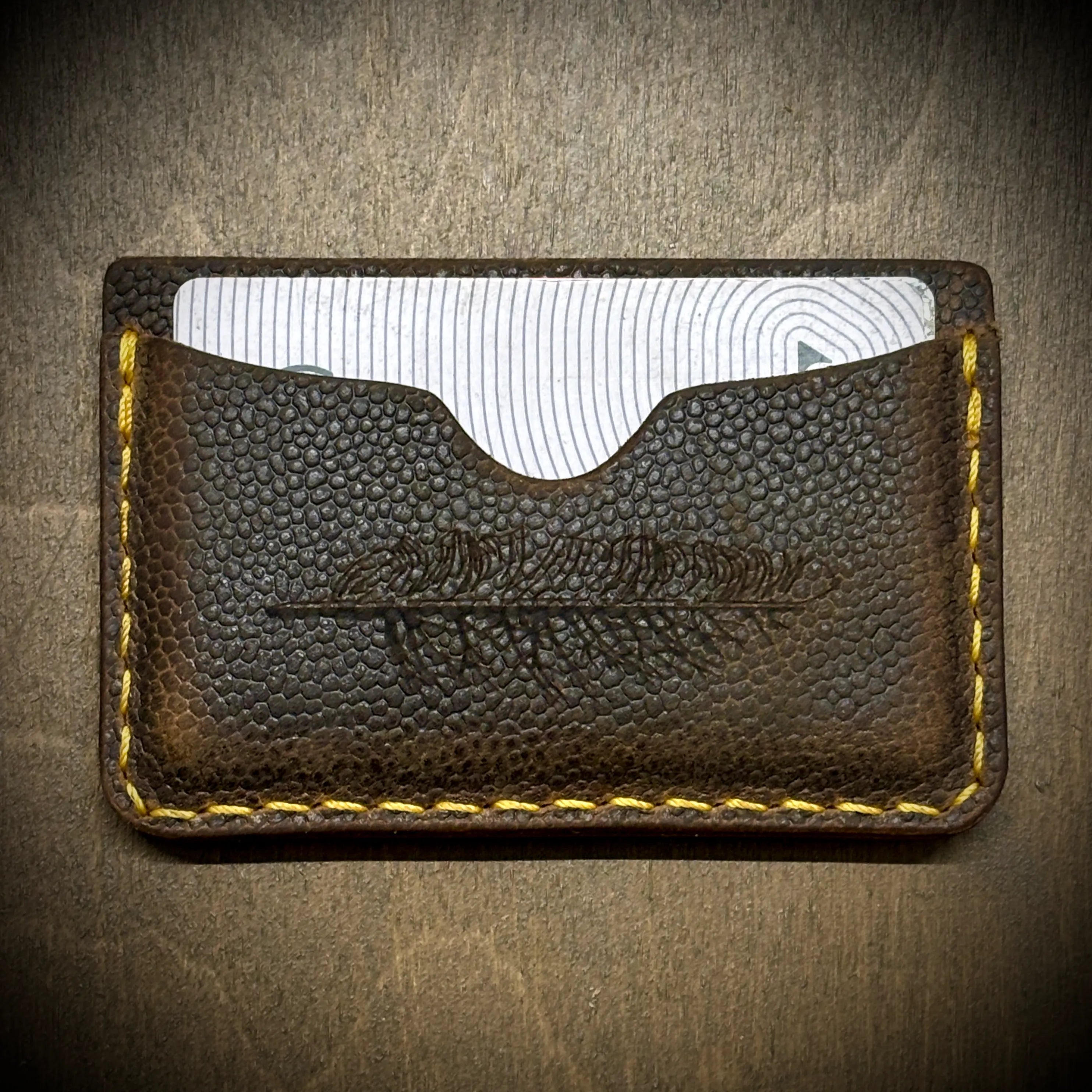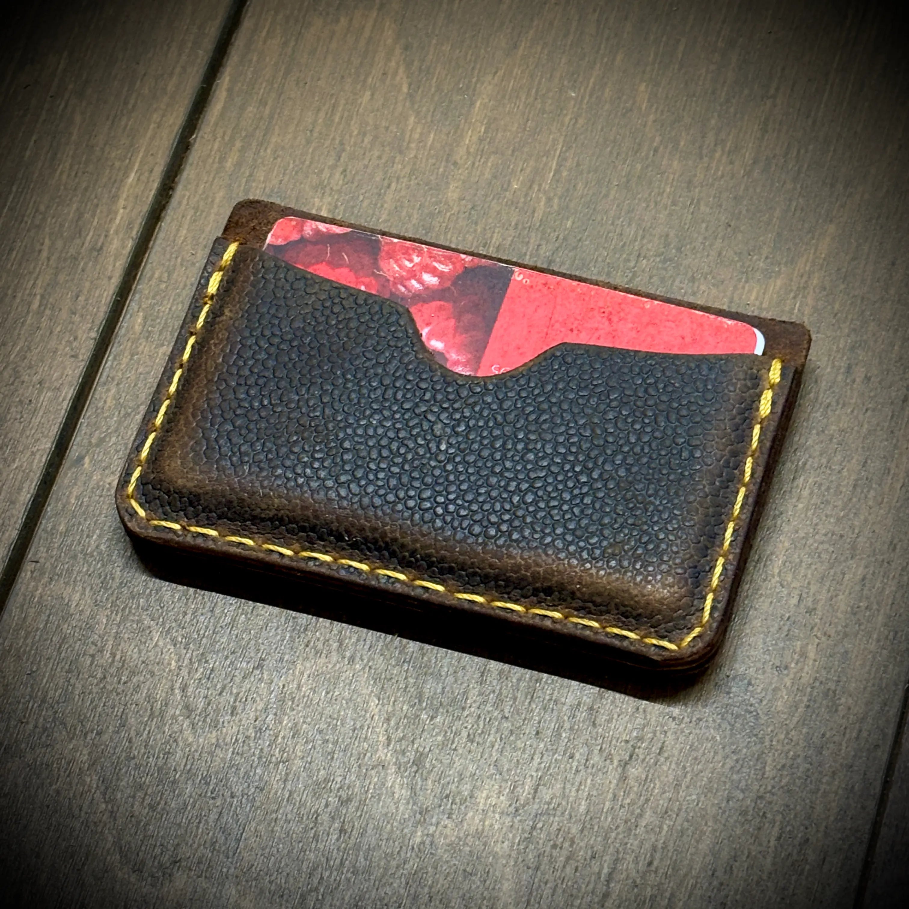 The clean two-pocket design comfortably holds 6–8 cards, while naturally stretching with use to fit more—without losing its slim profile. Simple, durable and made to be carried every day.